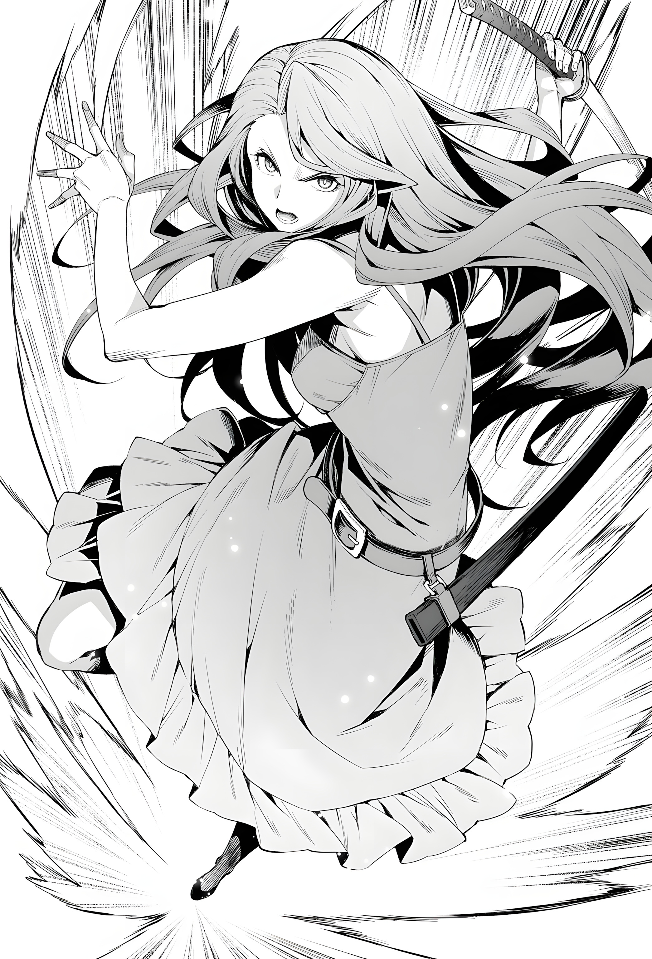 Vậy mà, một thiếu nữ rút thanh đoản kiếm phát sáng kỳ dị, mái tóc xanh biếc tung bay, lao thẳng vào hắn. Trong chớp mắt, cô ấy áp sát và vung kiếm chém mạnh từ phía sau tên dùng dao.