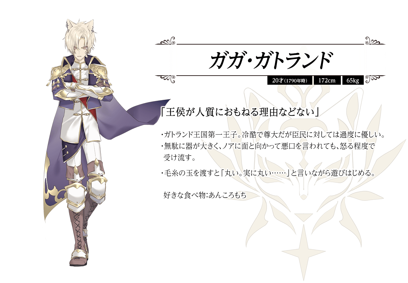 -Đệ nhất Hoàng tử của Vương quốc Gattoland. Tính cách lạnh lùng và kiêu ngạo, nhưng lại đặc biệt nhân từ với thần dân của mình. Ông anh này độ lượng một cách thừa thãi; ngay cả khi bị Noa mắng thẳng mặt, Gaga cũng chỉ nổi giận chút rồi thôi chứ không để bụng.